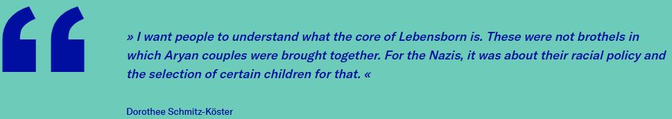 Dorothee Schmitz-Köster always wanted to collect as much material as possible in her research so as to record the voices and stories of the contemporary witnesses – who are becoming fewer and fewer in number. Alongside a good overview of the many different individual fates, it was also important to her to clear up the myths and rumours surrounding Lebensborn as a “breeding institution”